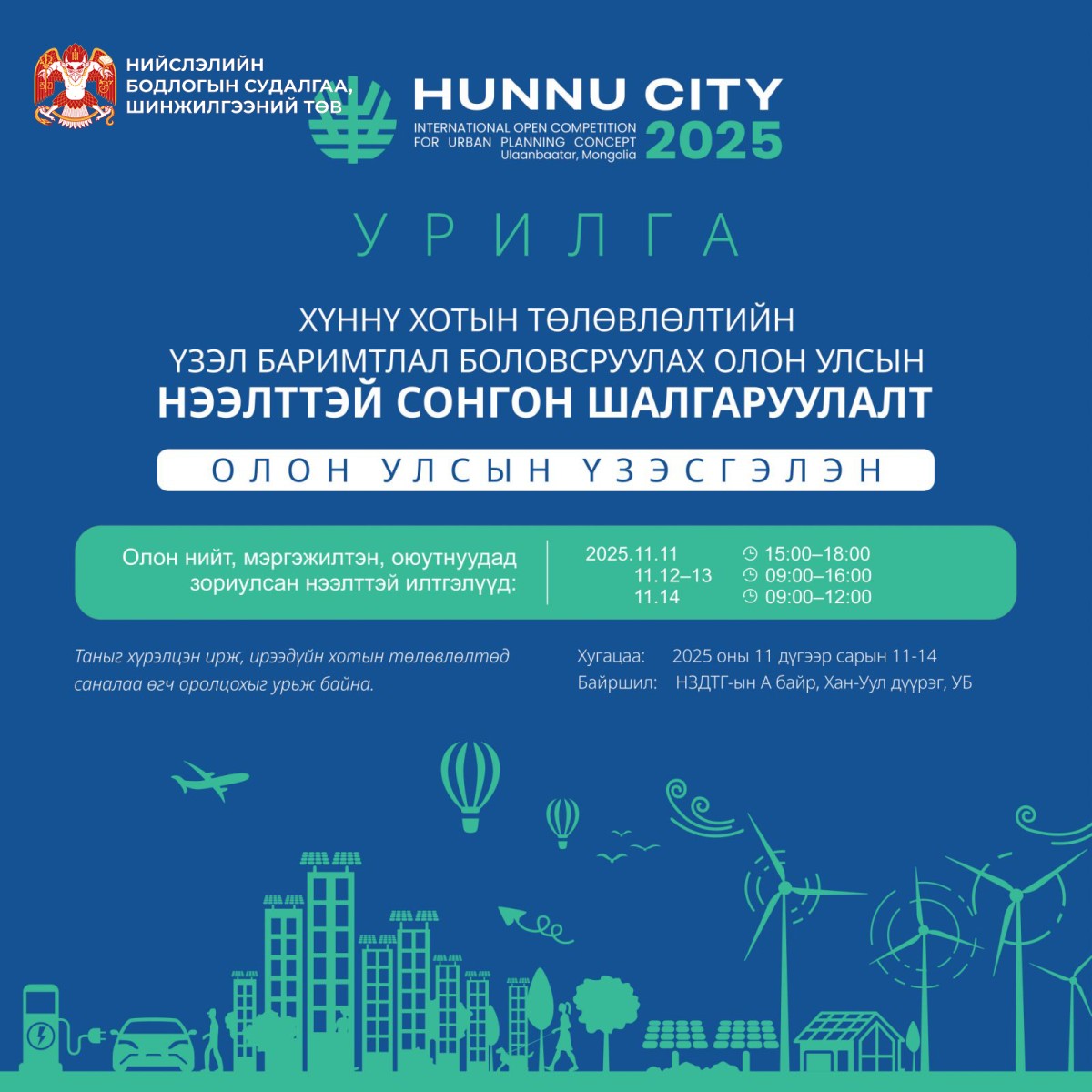 Улаанбаатар хотын ирээдүйн хөгжлийн чиг хандлагыг тодорхойлох “Хүннү City 2025” олон улсын сонгон шалгаруулалт өнөөдрөөс эхэллээ. Энэхүү уралдааны гол зорилго нь хотын орон зайн төлөвлөлт, дэд бүтцийн шийдэл, ногоон байгууламж, нийтийн орон зай зэрэгт шинэлэг, ухаалаг концепцийг тодорхойлох юм. Сонгон шалгаруулалтад дотоод болон олон улсын архитектор, хот төлөвлөлөгчид оролцож, ирээдүйн “Хүннү City”-ийн хөгжлийн үзэл баримтлалыг боловсруулах юм. Шалгаруулалтын үр дүнд шилдэг концепц төслийг сонгон, бодит хэрэгжилтийн шатанд оруулна. Хүрээлэн буй орчин, ногоон хөгжлийг дэмжих, дэд бүтцийн ухаалаг шийдлийг бий болгох зорилготой энэхүү арга хэмжээ нь хотын ирээдүйн хөгжлийг тодорхойлох чухал алхам болох юм.