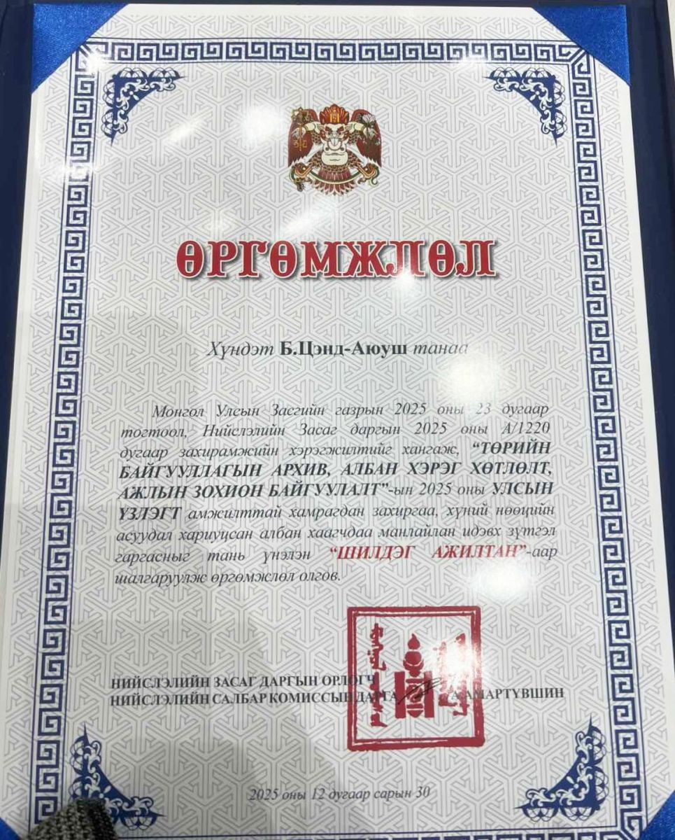 Мөн уг ажлын хүрээнд төрийн байгууллагын архив, албан хэрэг хөтлөлт, ажлын зохион байгуулалтын чиглэлээр бодит үр дүн гарган, манлайлан ажилласан гавьяаг нь үнэлж, Нийслэлийн Бодлогын судалгаа, шинжилгээний төвийн Захиргааны ахлах мэргэжилтэн Б.Цэнд-Аюушийг “Шилдэг ажилтан” цол, “Өргөмжлөл”-өөр тус тус шагнасан юм.