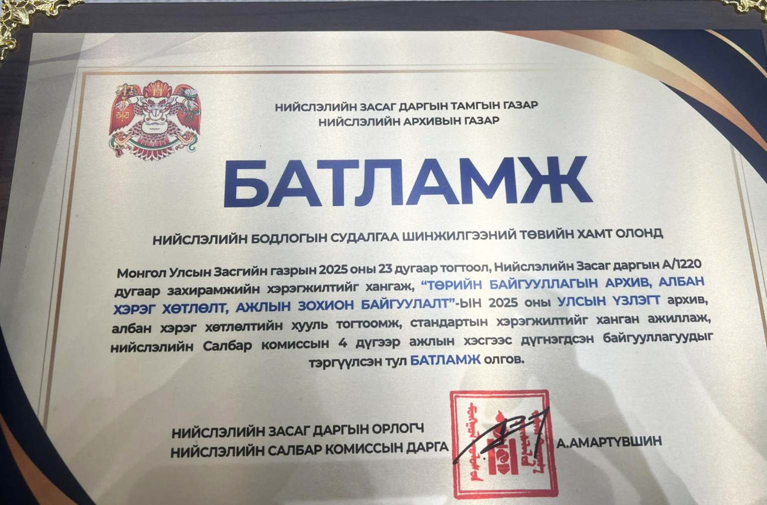 Тус төв нь Монгол Улсын Засгийн газрын 2025 оны 23 дугаар тогтоол, Нийслэлийн Засаг даргын 2025 оны А/220 дугаар захирамжийн хэрэгжилтийг ханган ажиллаж, “Төрийн байгууллагын архив, албан хэрэг хөтлөлт, ажлын зохион байгуулалт”-ын 2025 оны улсын үзлэгт амжилттай оролцсон байна. Улмаар хууль тогтоомж, стандартын шаардлагыг бүрэн ханган ажилласныг үнэлж, байгууллагын хамт олныг “Батламж”-аар шагналаа.